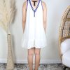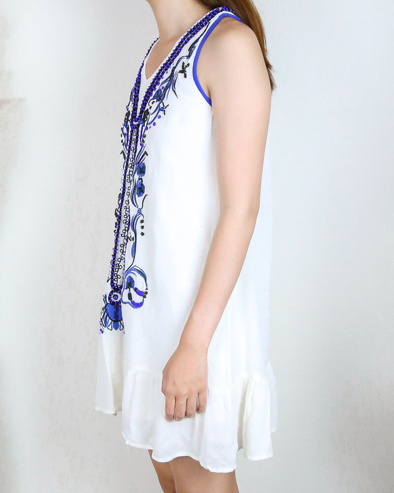 Gorgeous cream/ivory ethereal dress with blue embroidery designs and hand-sewn beads detailing. Pair this dress with some flatform sandals for the perfect beach look in the summer!