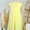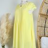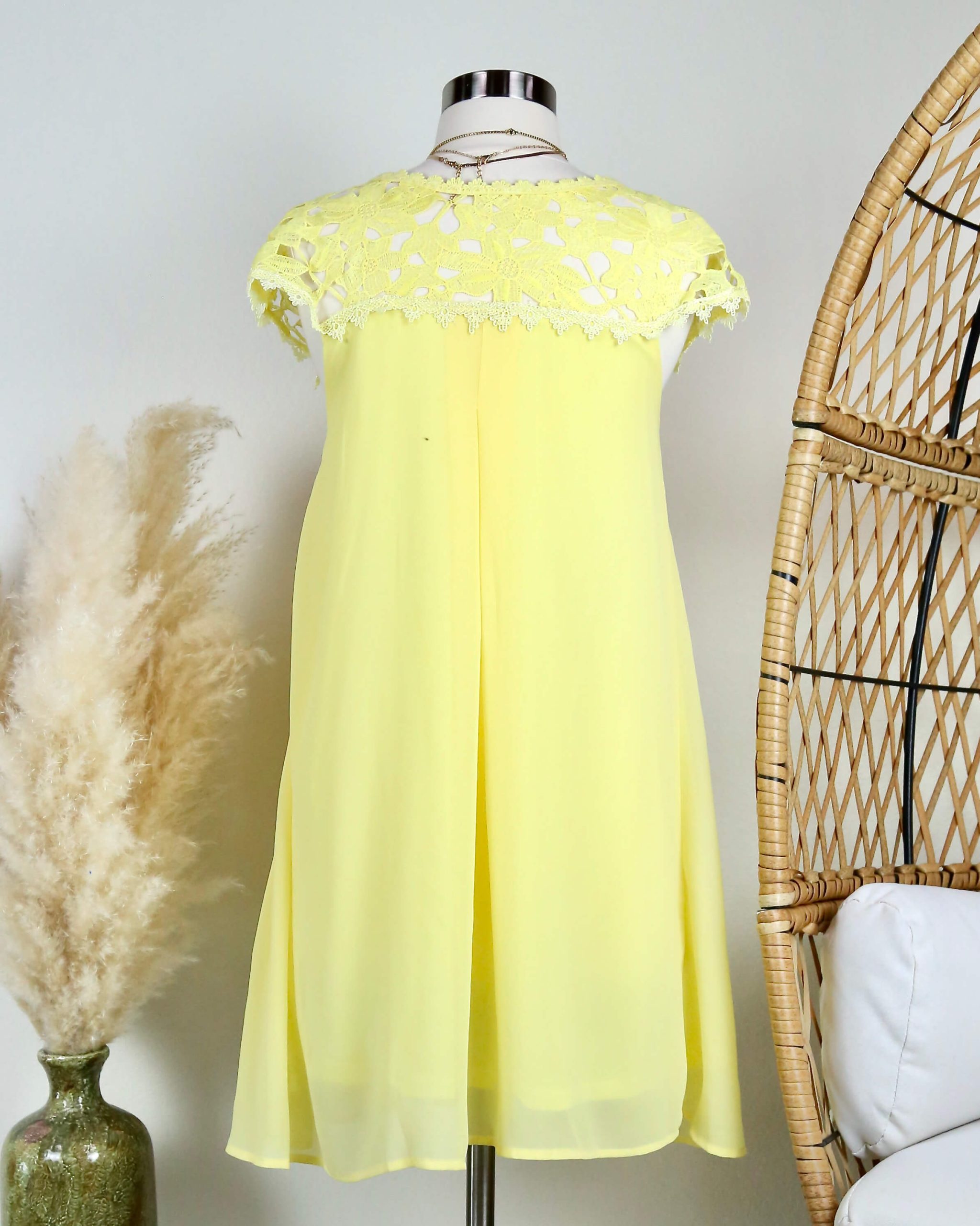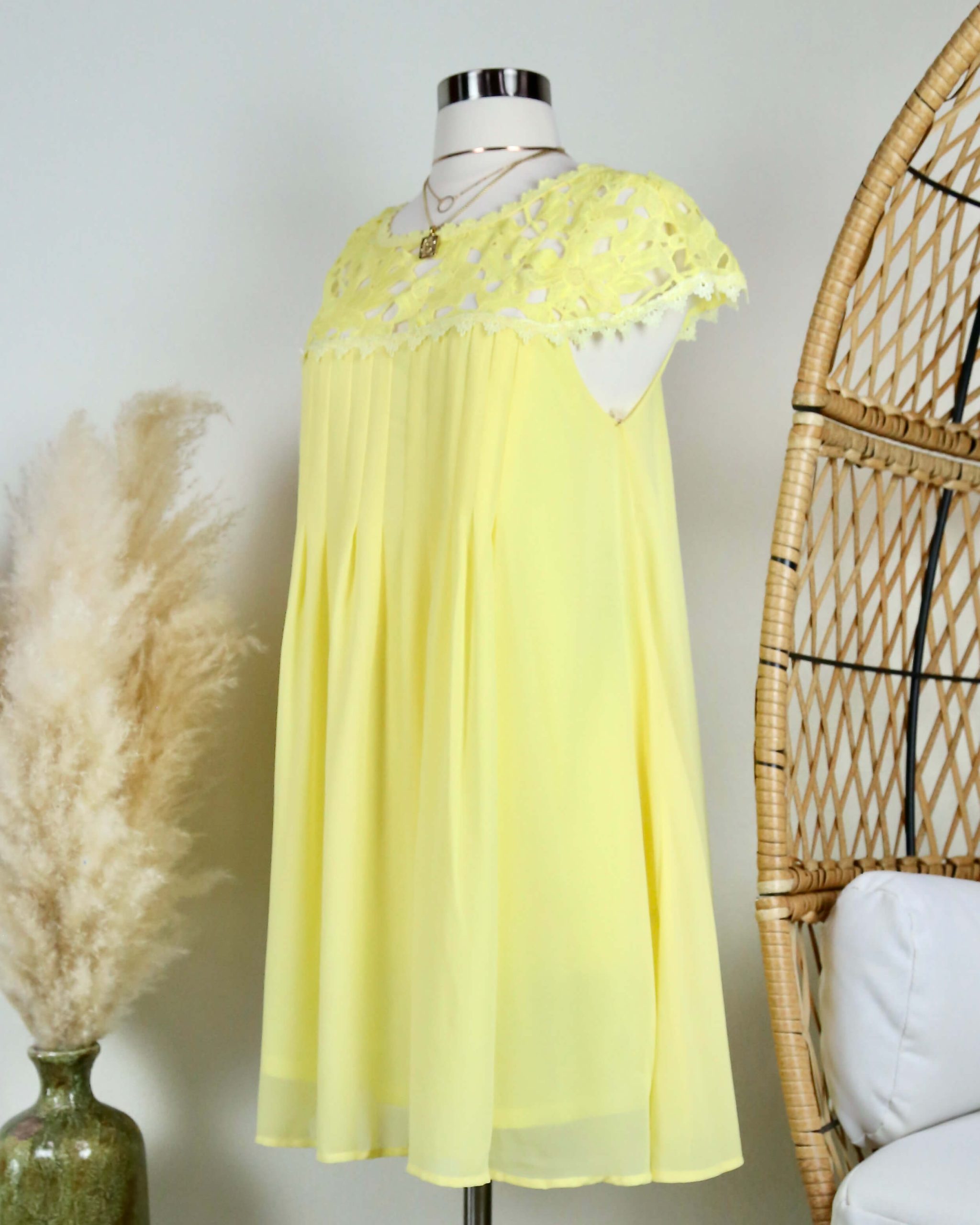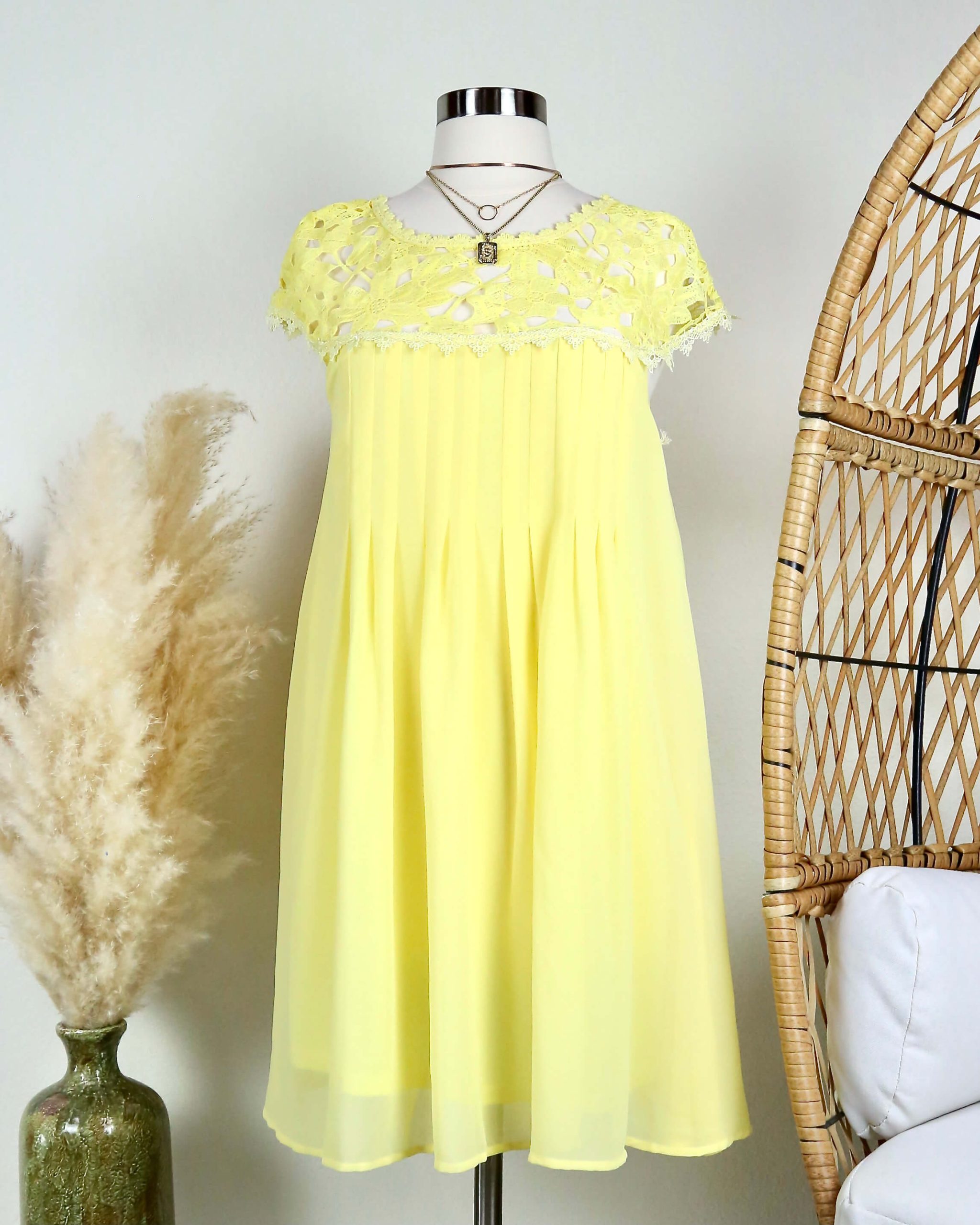 Gorgeous flowy yellow dress that features a pleated front, cap sleeves, and a sheer yoke upper.